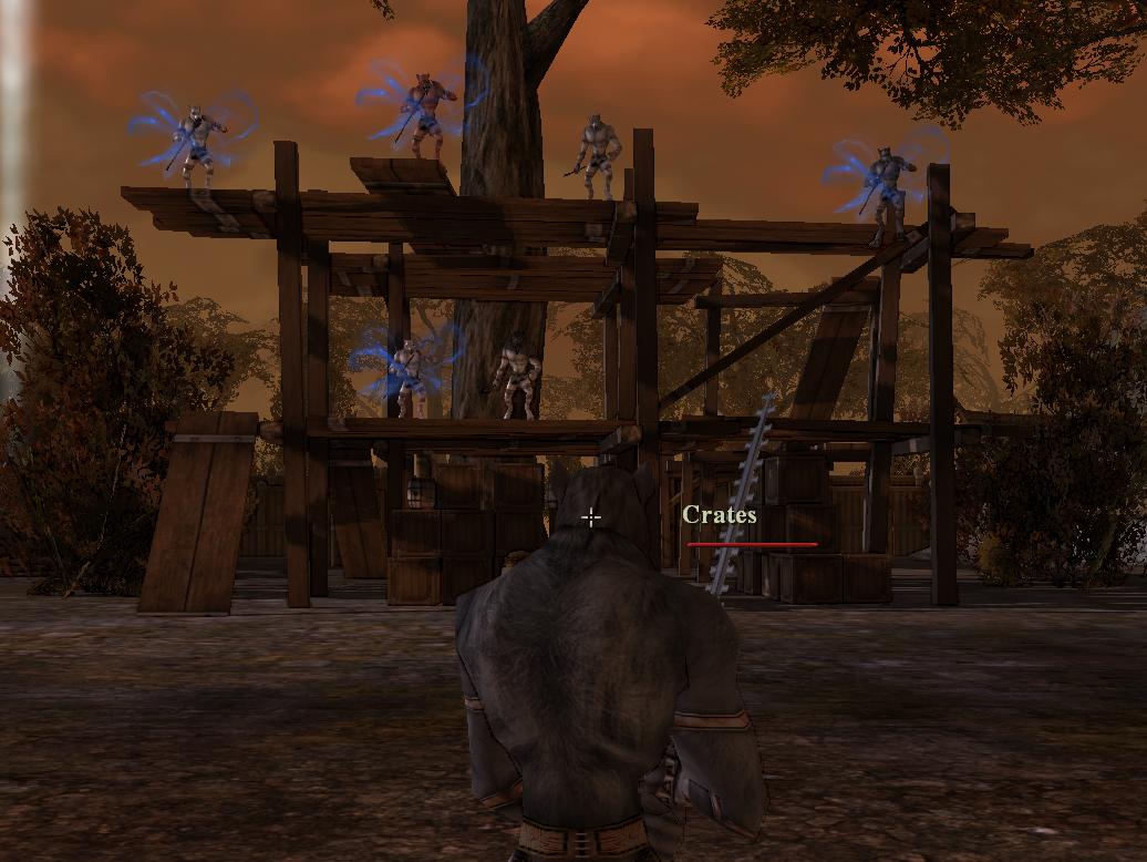 The origin of this fun was somewhat unexpected and random. We built scaffolding in our guilds hamlet (it was cheap, so we figured why not), which to our surprise created a two story wooden skeletal structure in the middle of our town. On it’s own it does little to nothing for our towns ‘power’ or ‘stats’. Since the thing was screaming at us “American Gladiators”, we decided to have a little naked newb-weapon only combat tournament. The rules were rather simple: four people start at the top level, last one standing wins the round. If you miss a jump or just run off and hit the ground, you are out. Magic was limited to non-regent spells.